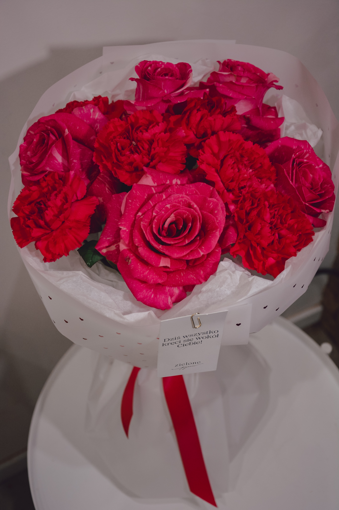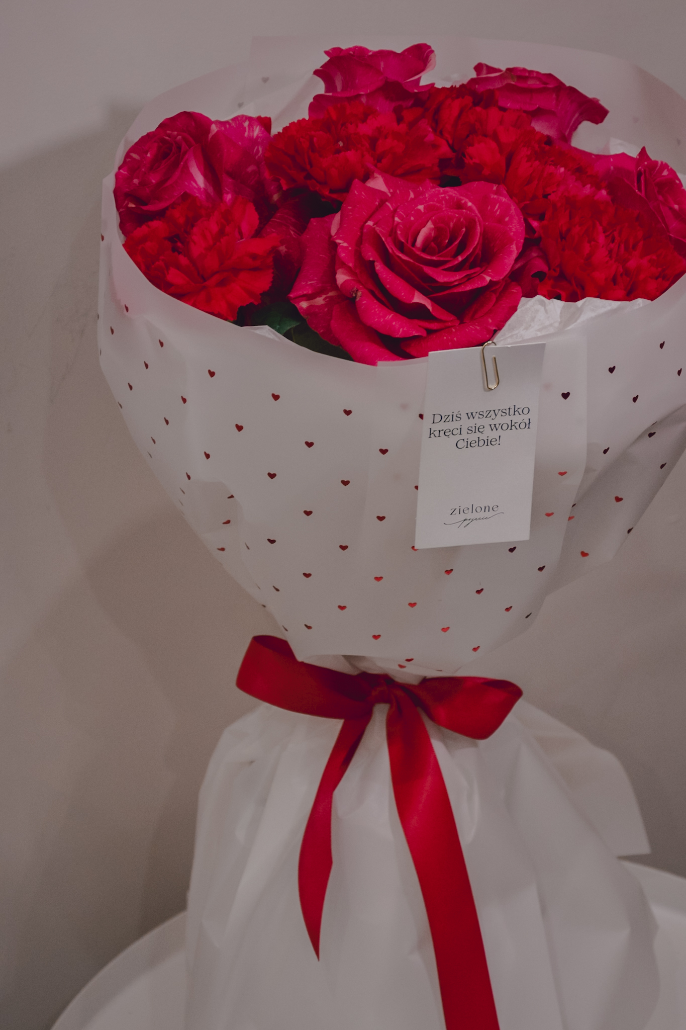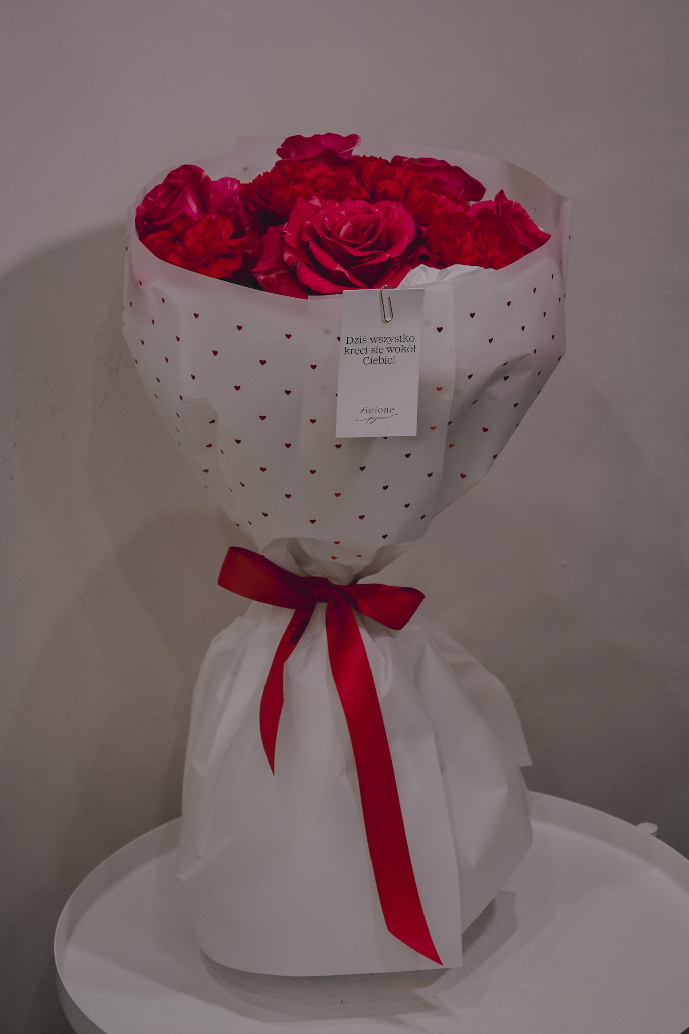 Bukiet z czerwonych róż, otulony ozdobnym papierem.
