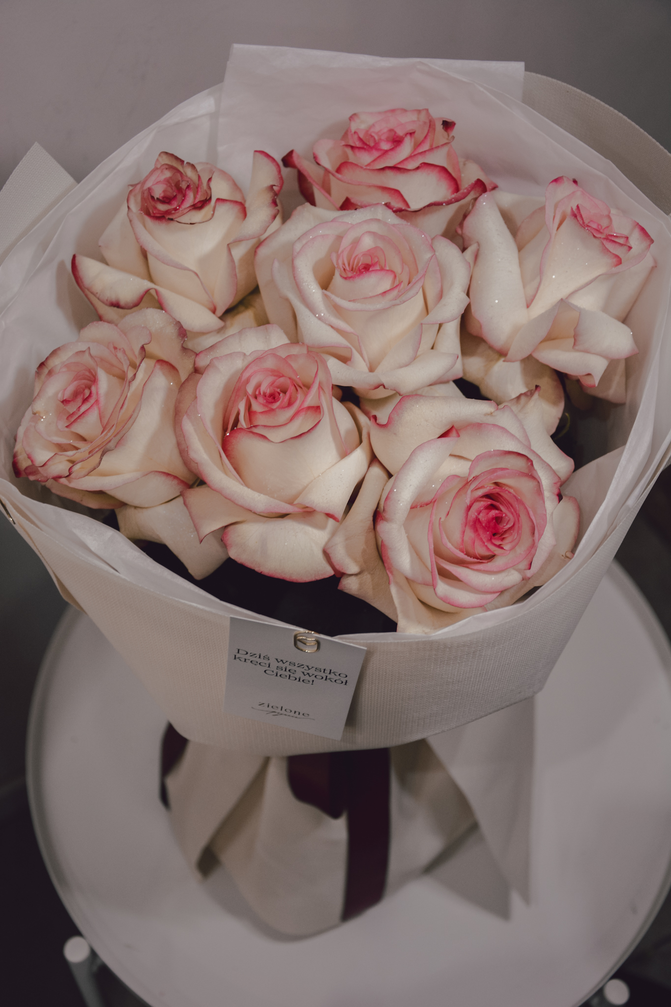 Bukiet z 7 róż PALOMA, posypanych brokatem, otulony ozdobnym papierem.