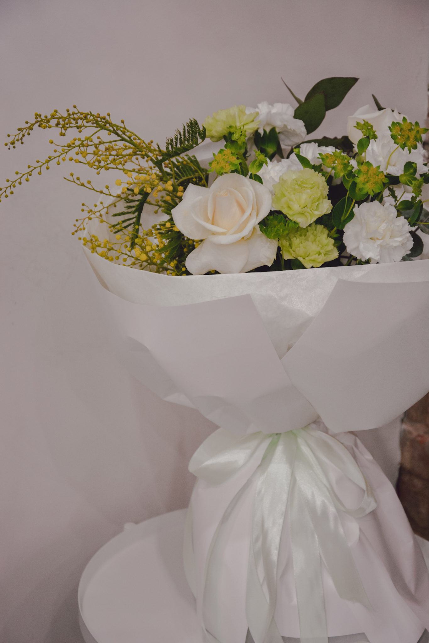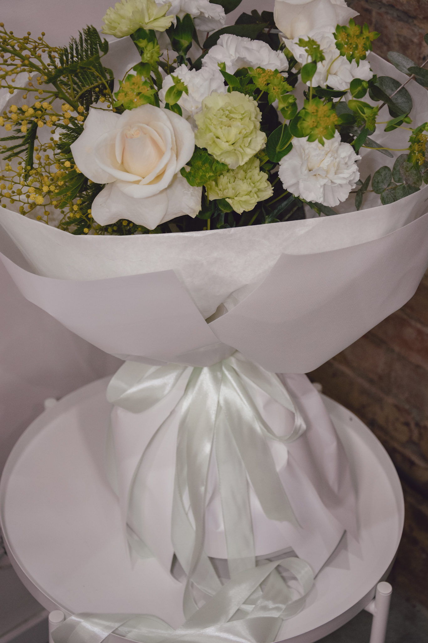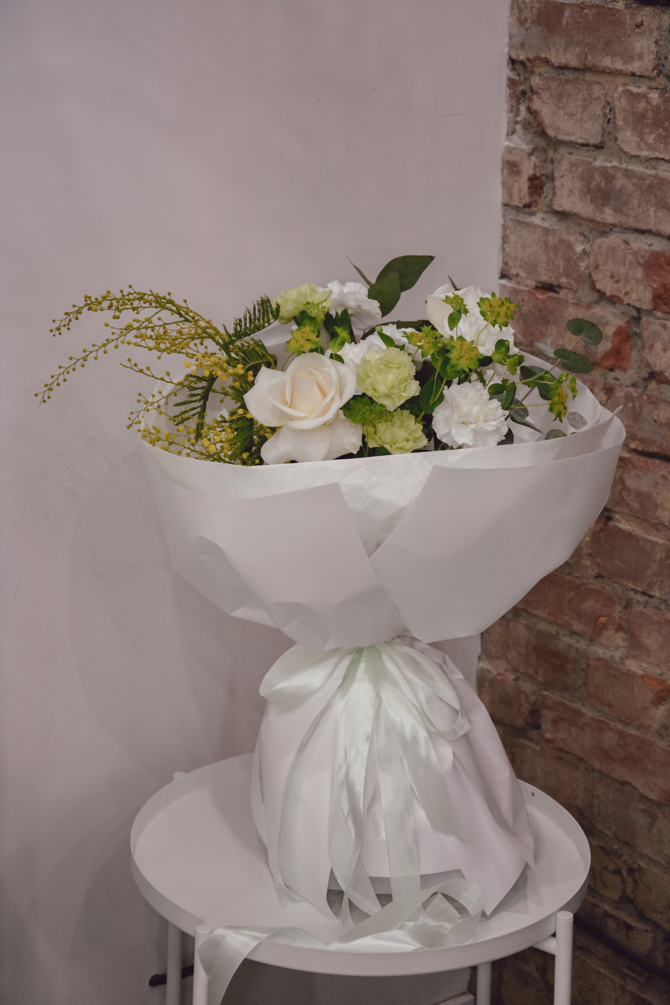 Bukiet z seledynowych i śmietankowych kwiatów, otulony ozdobnym papierem.