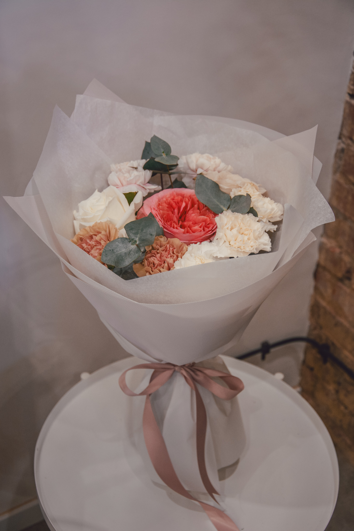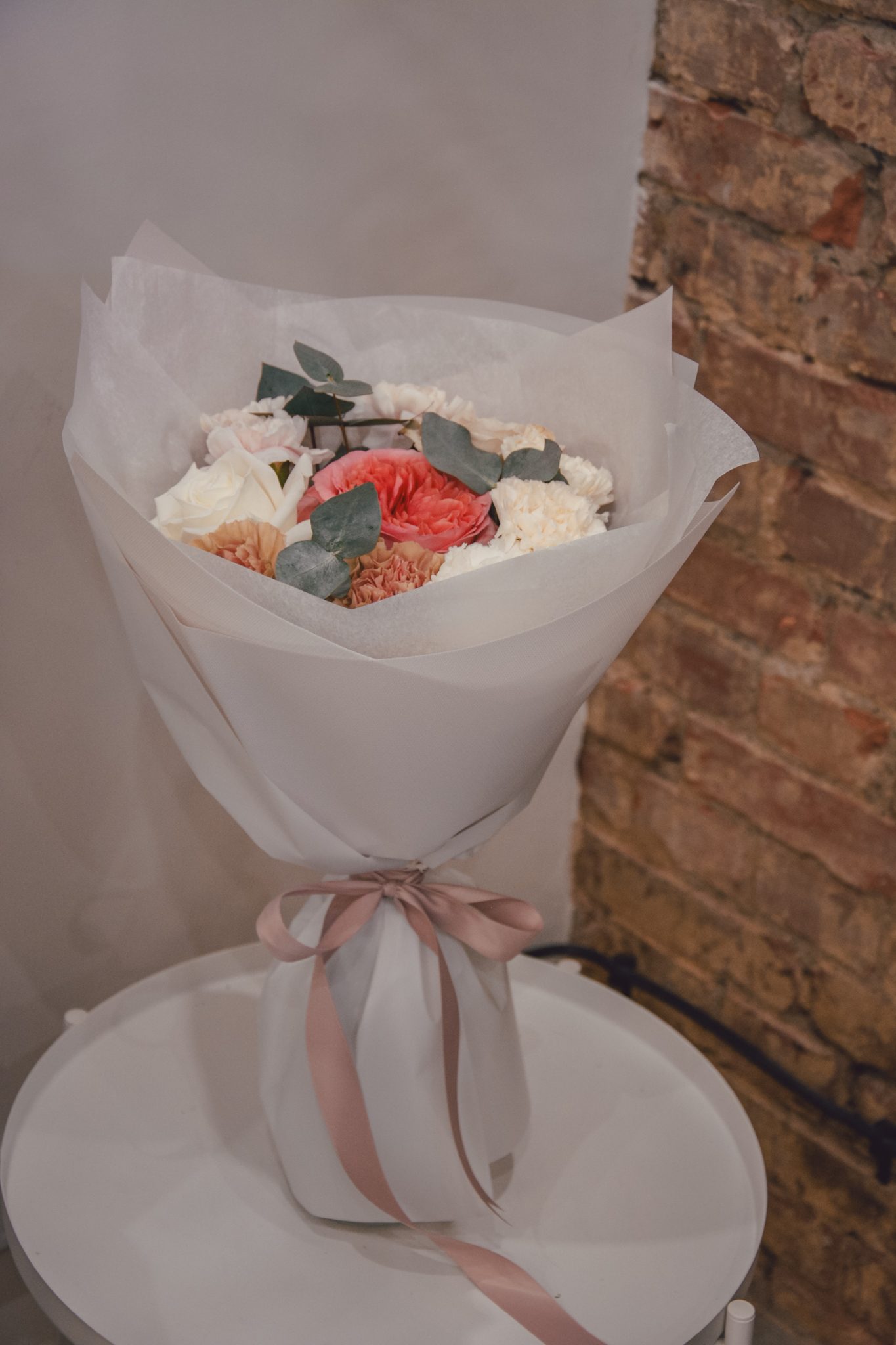 Bukiet kwiatów w odcieniach beżu, różu i śmietanki, otulony ozdobnym papierem.