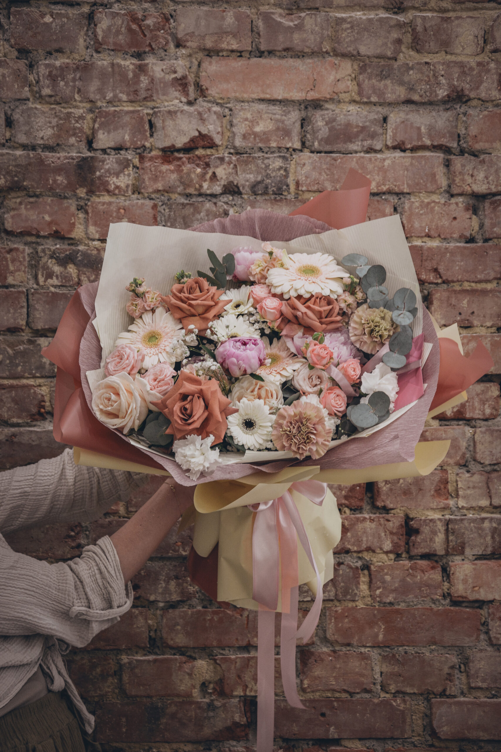Bukiet z kwiatów w kolorach brązu i beżu, otulony ozdobnym papierem.