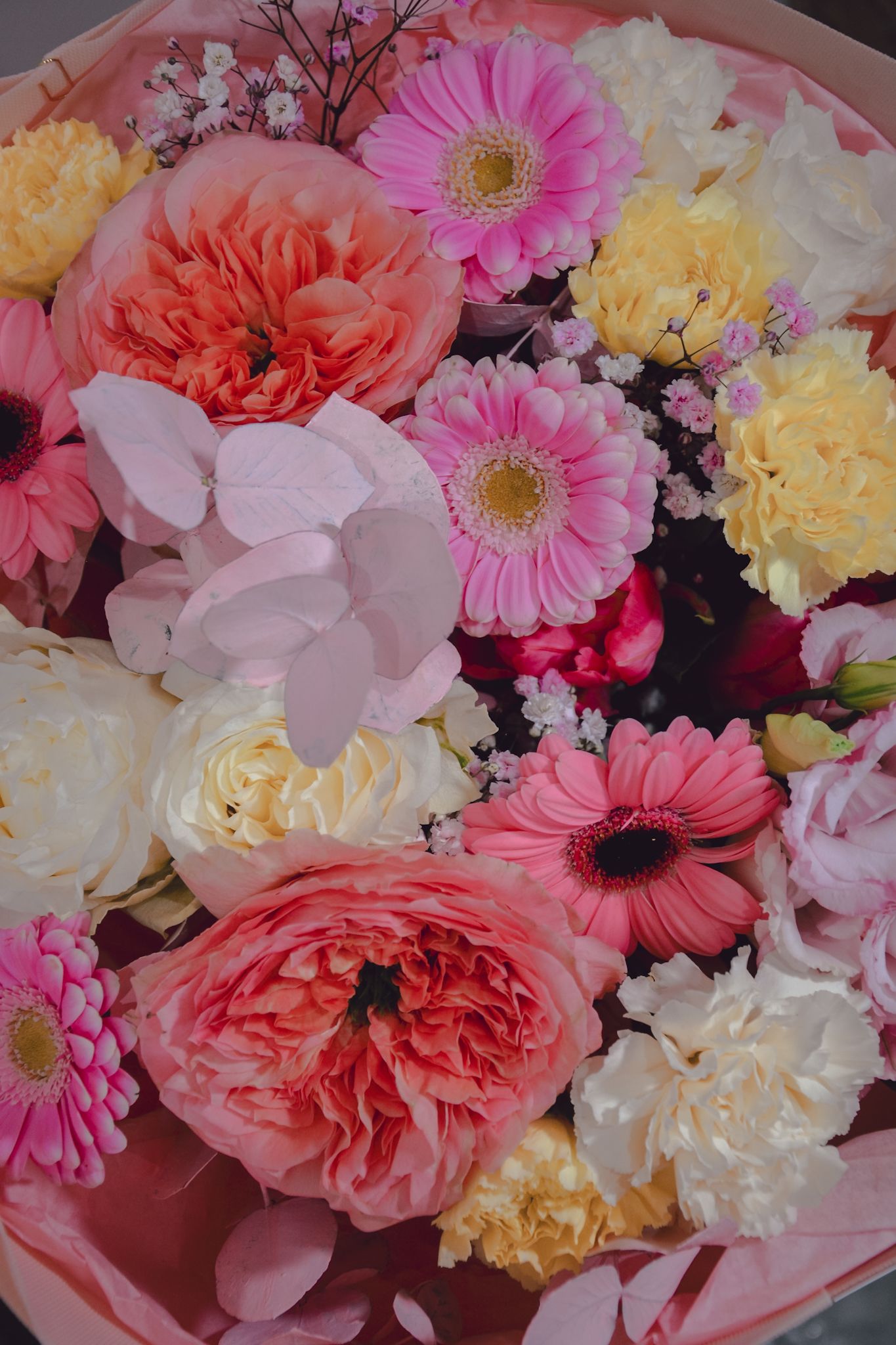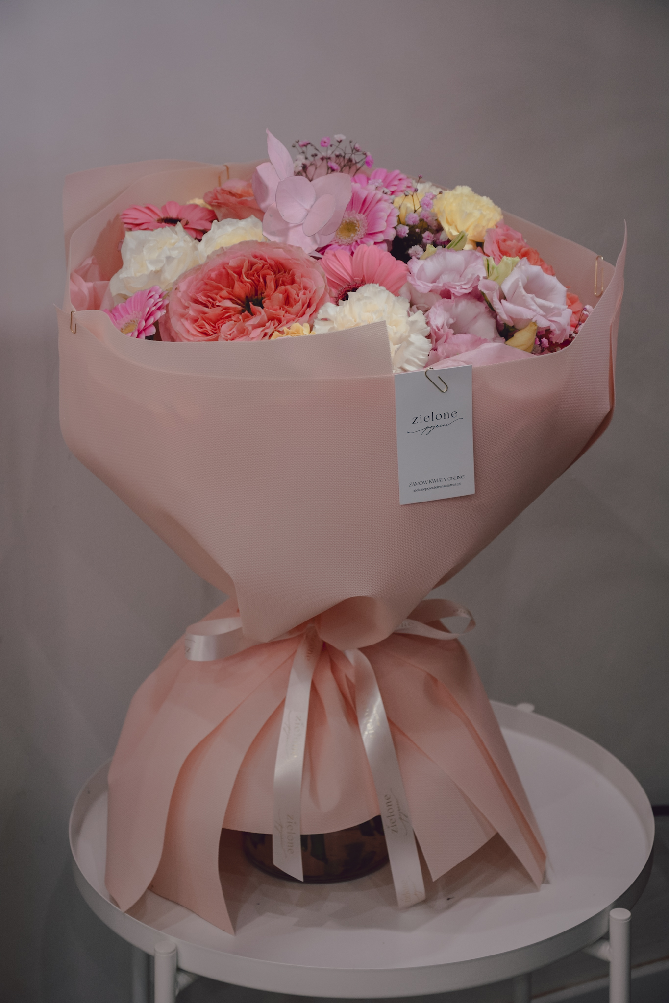 Bukiet mieszanych kwiatów w wiosennych odcieniach, otulony ozdobnym papierem.