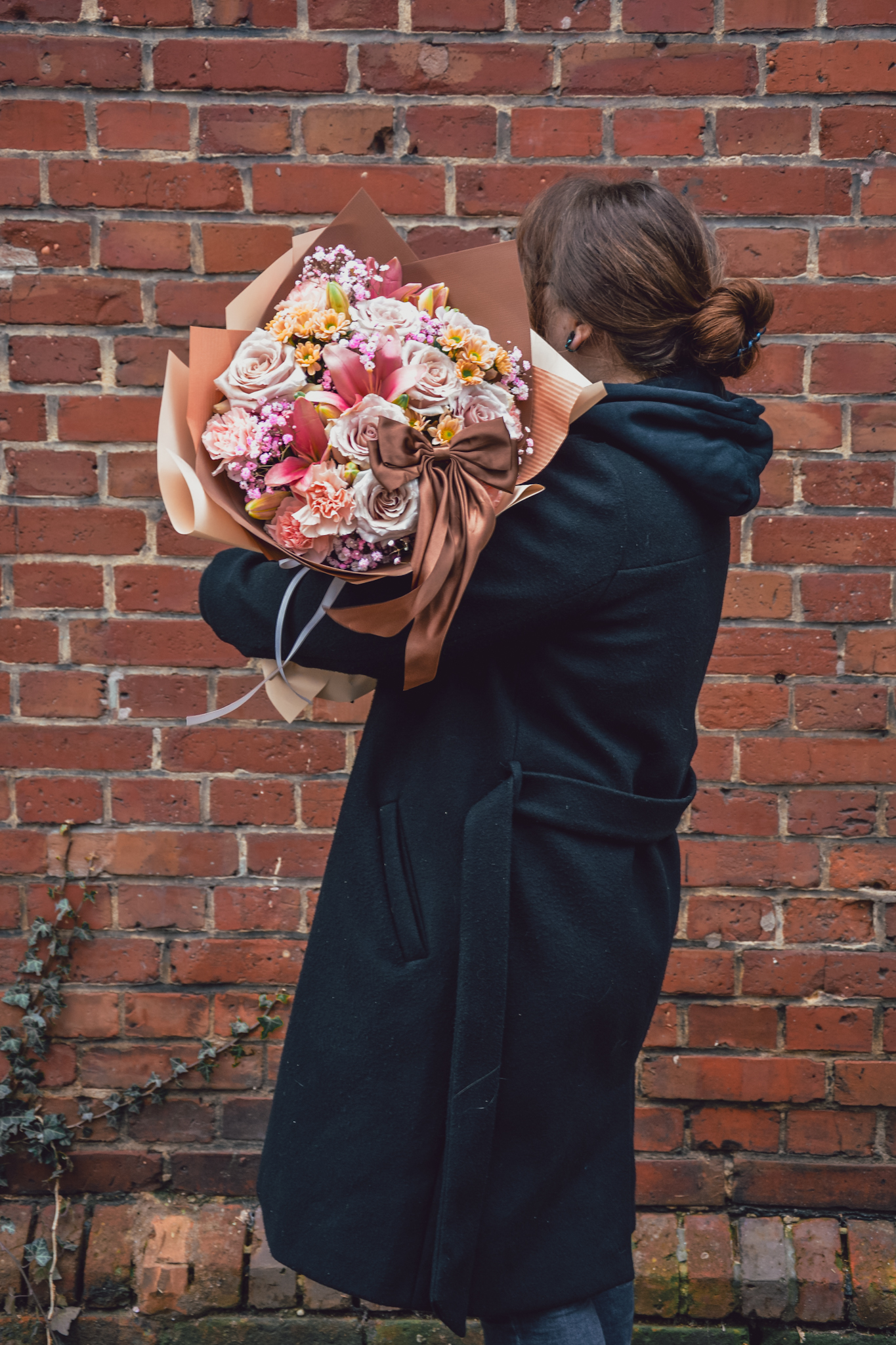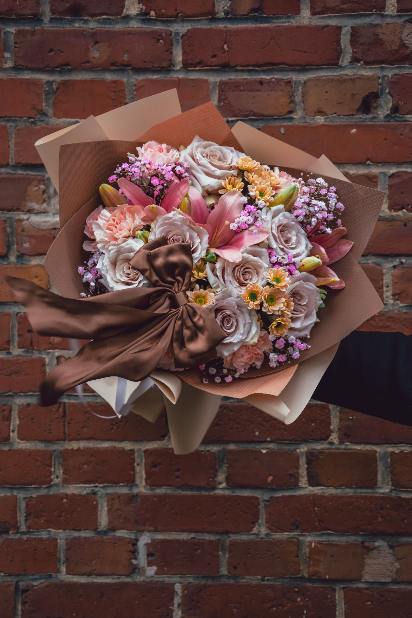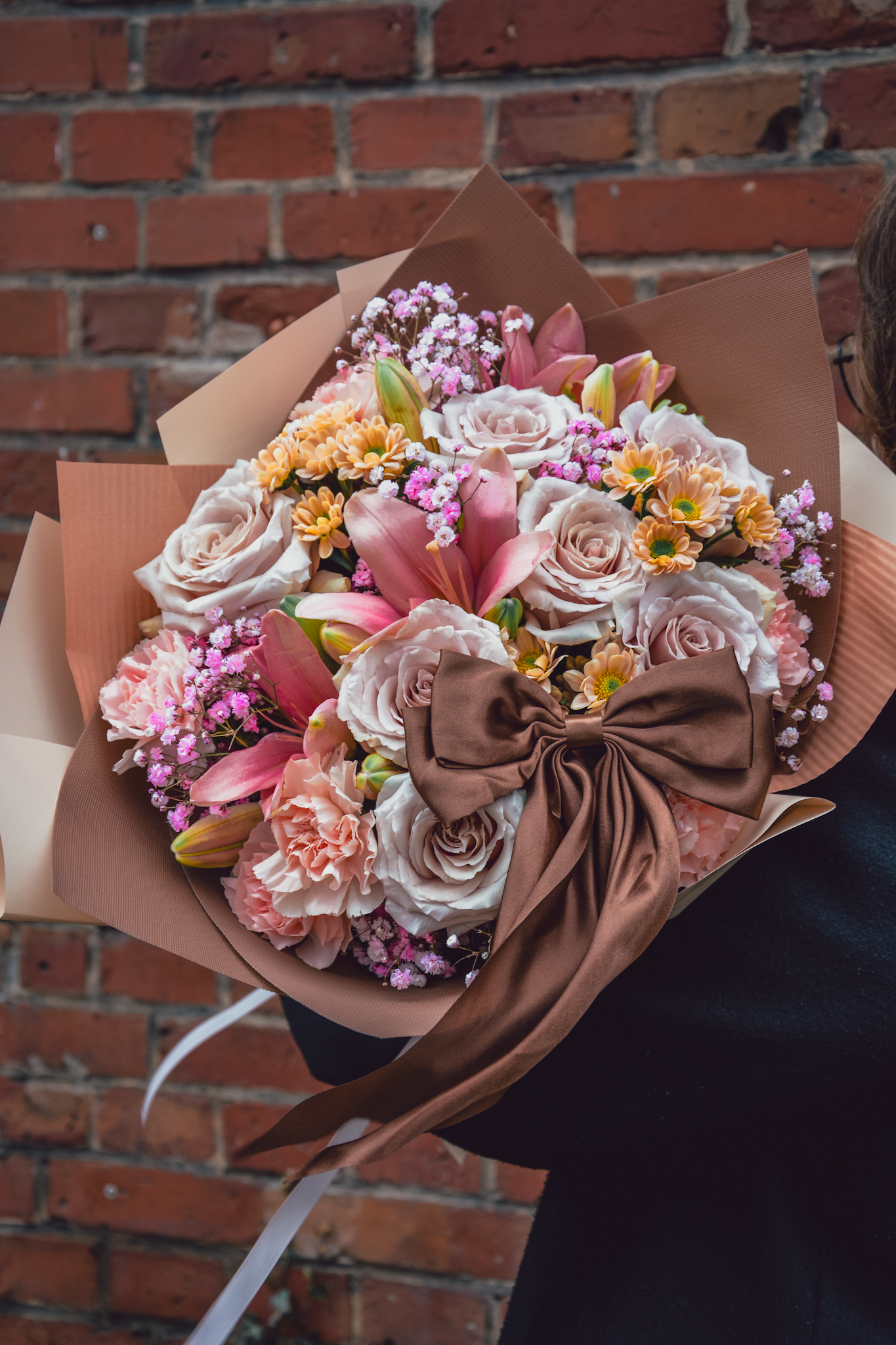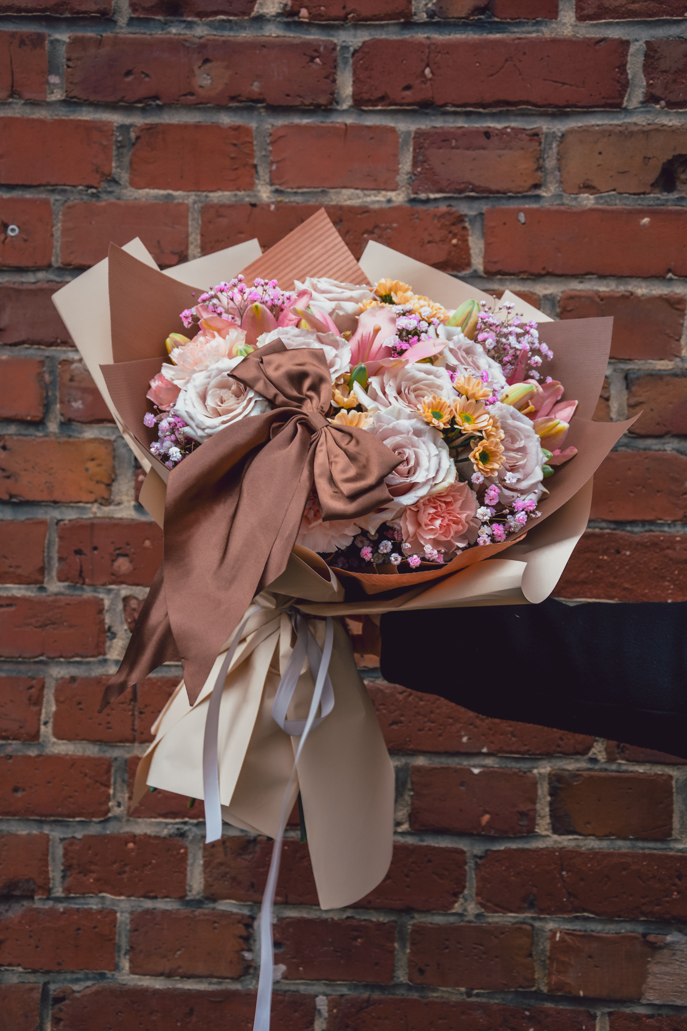 Bukiet kwiatów w odcieniach beżu, różu i śmietanki, otulony ozdobnym papierem.