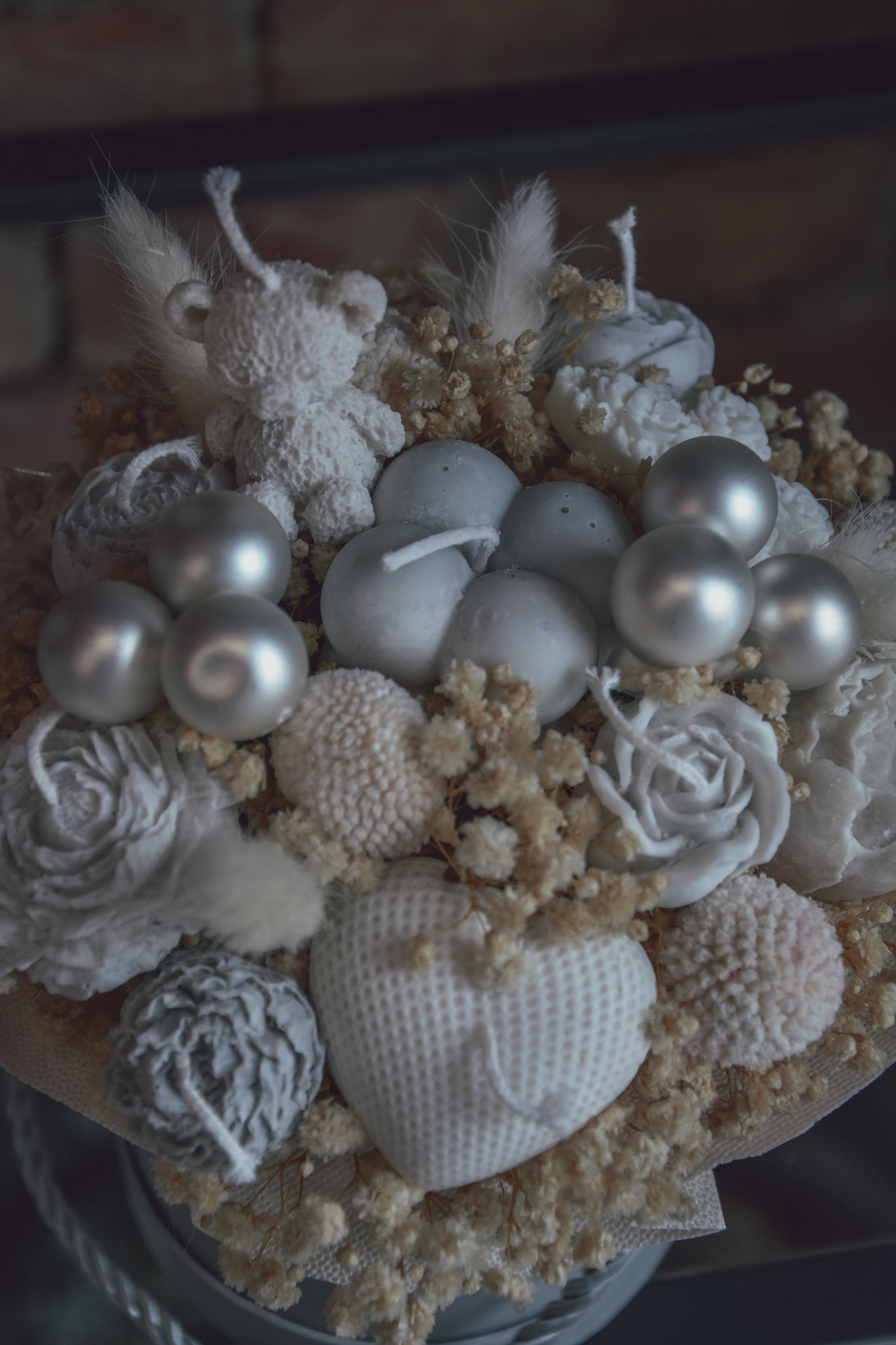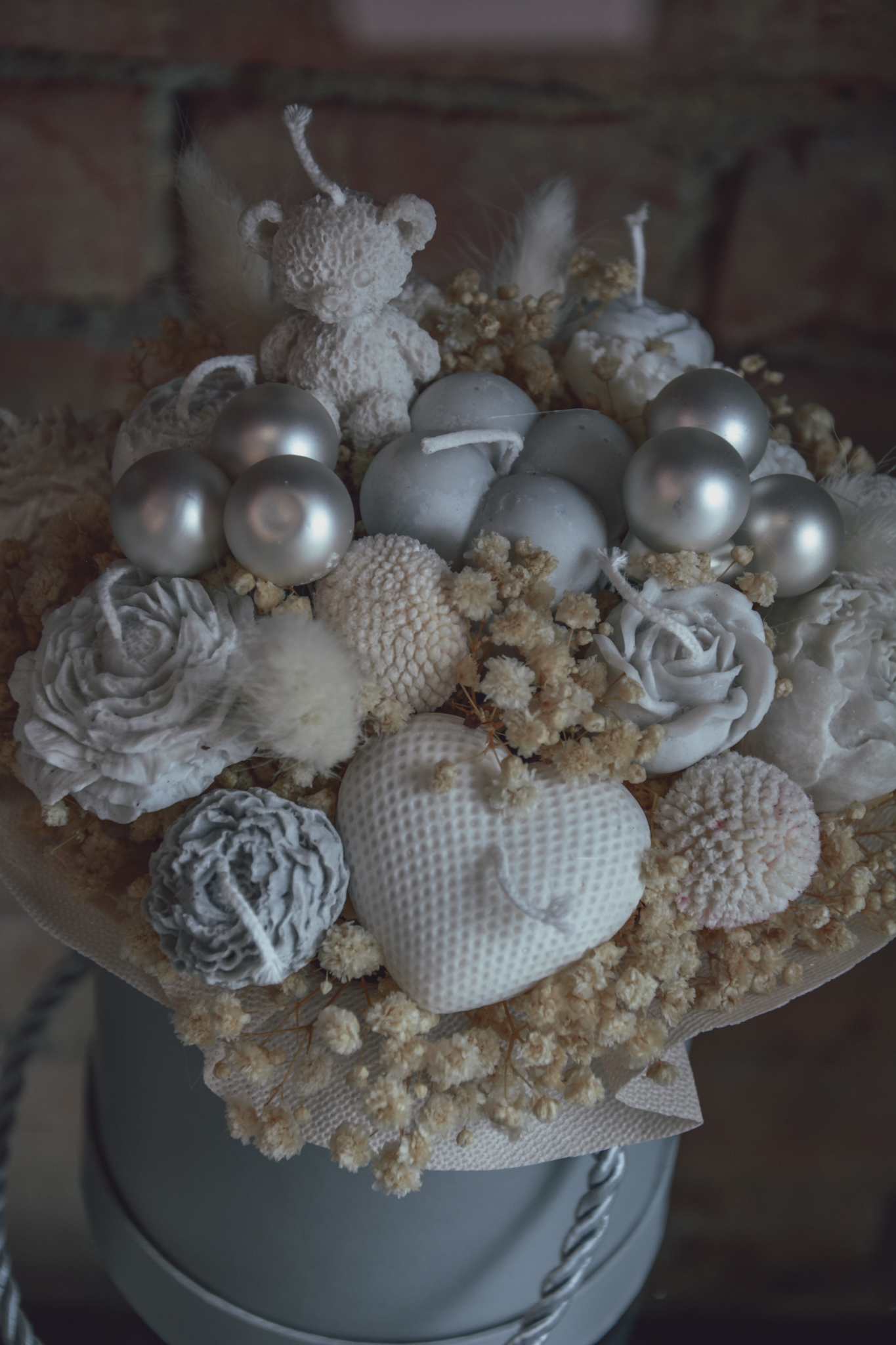 Flowerbox świec sojowych w towarzystwie suszu, całość w kolorach szarości.