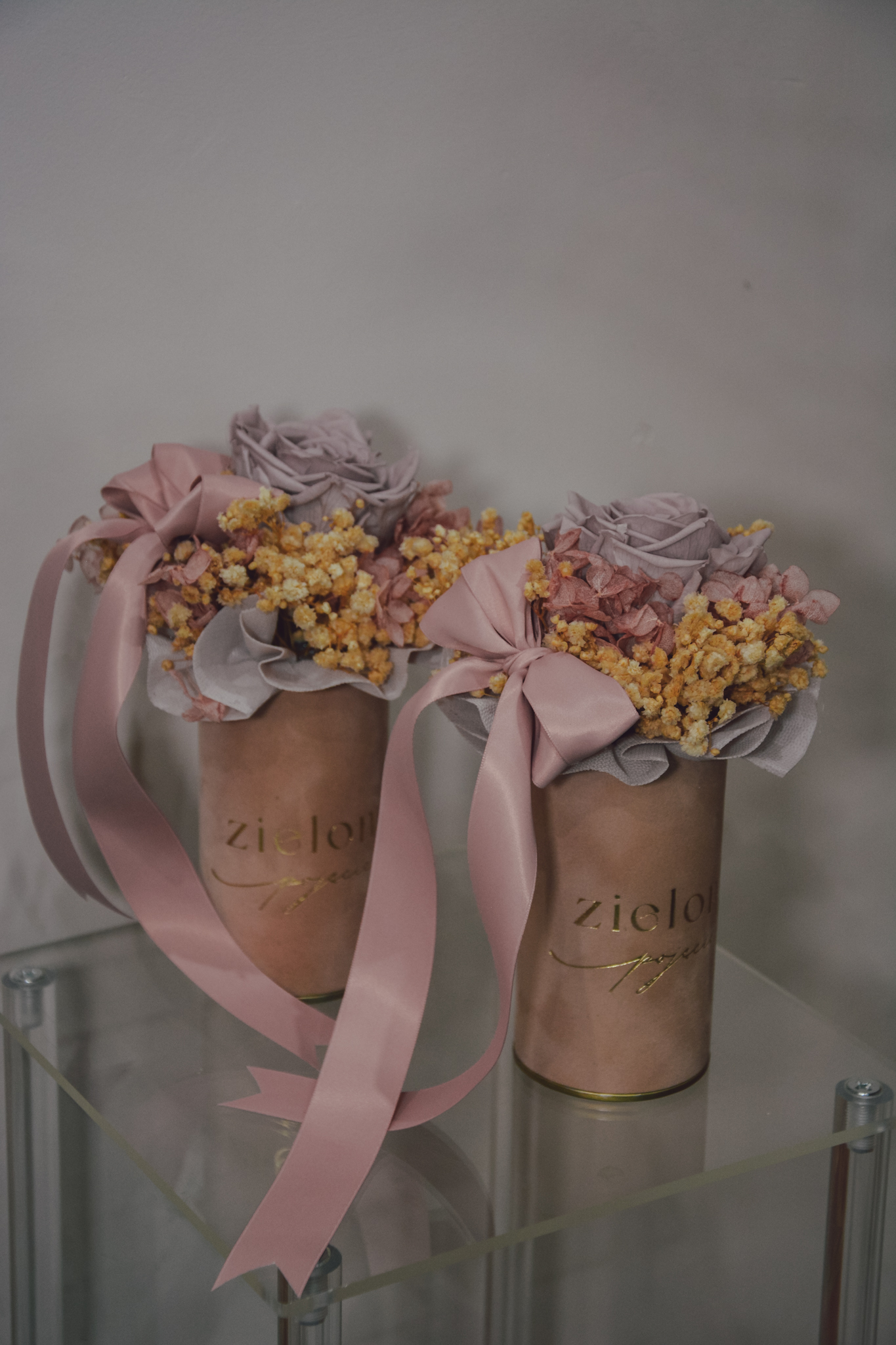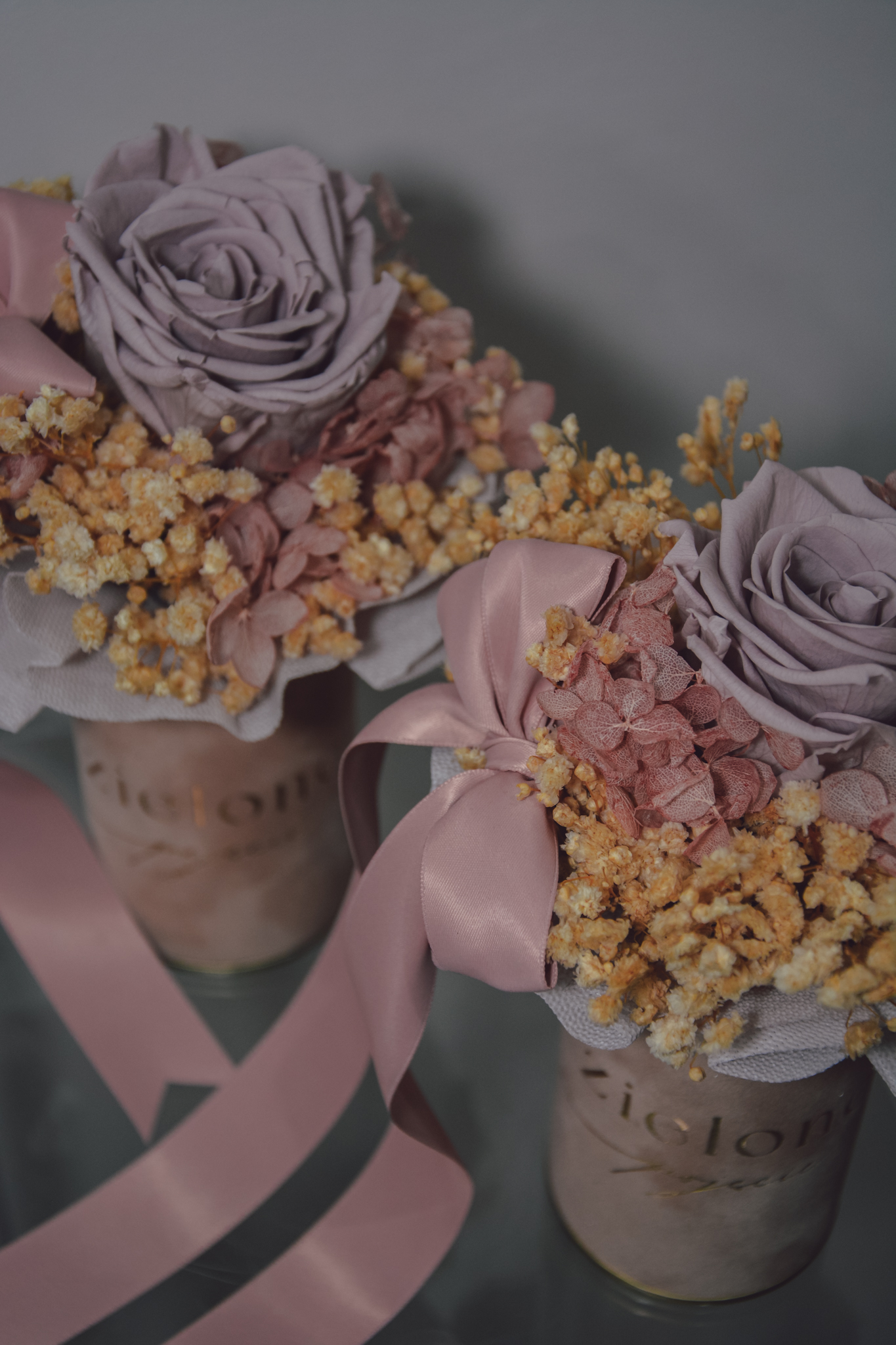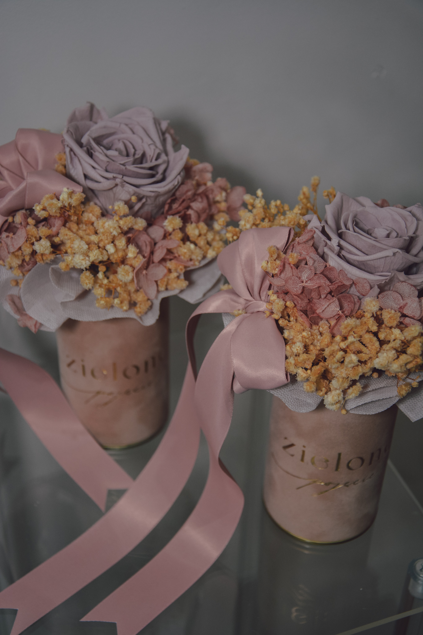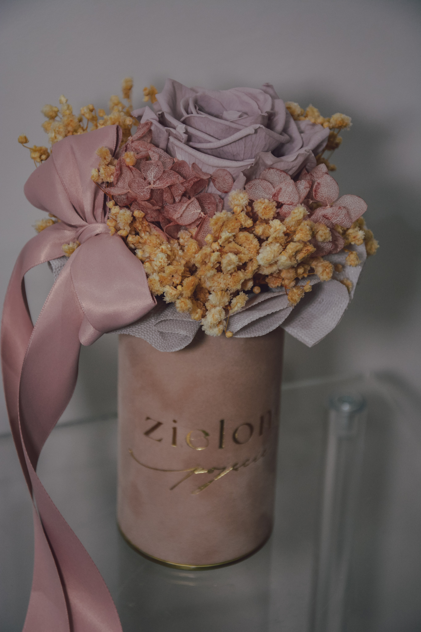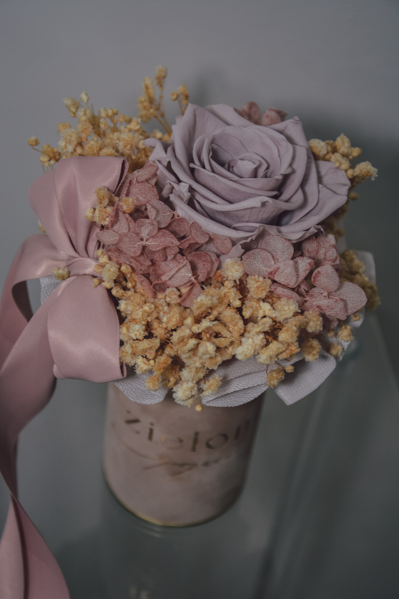 Flowerbox z róży i gipsówki stabilizowanej, całość w kolorach różu.