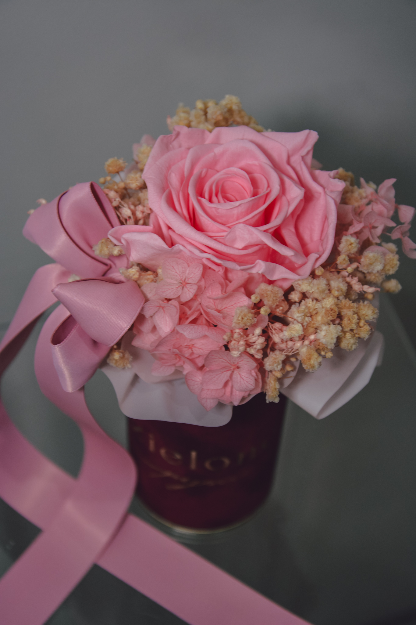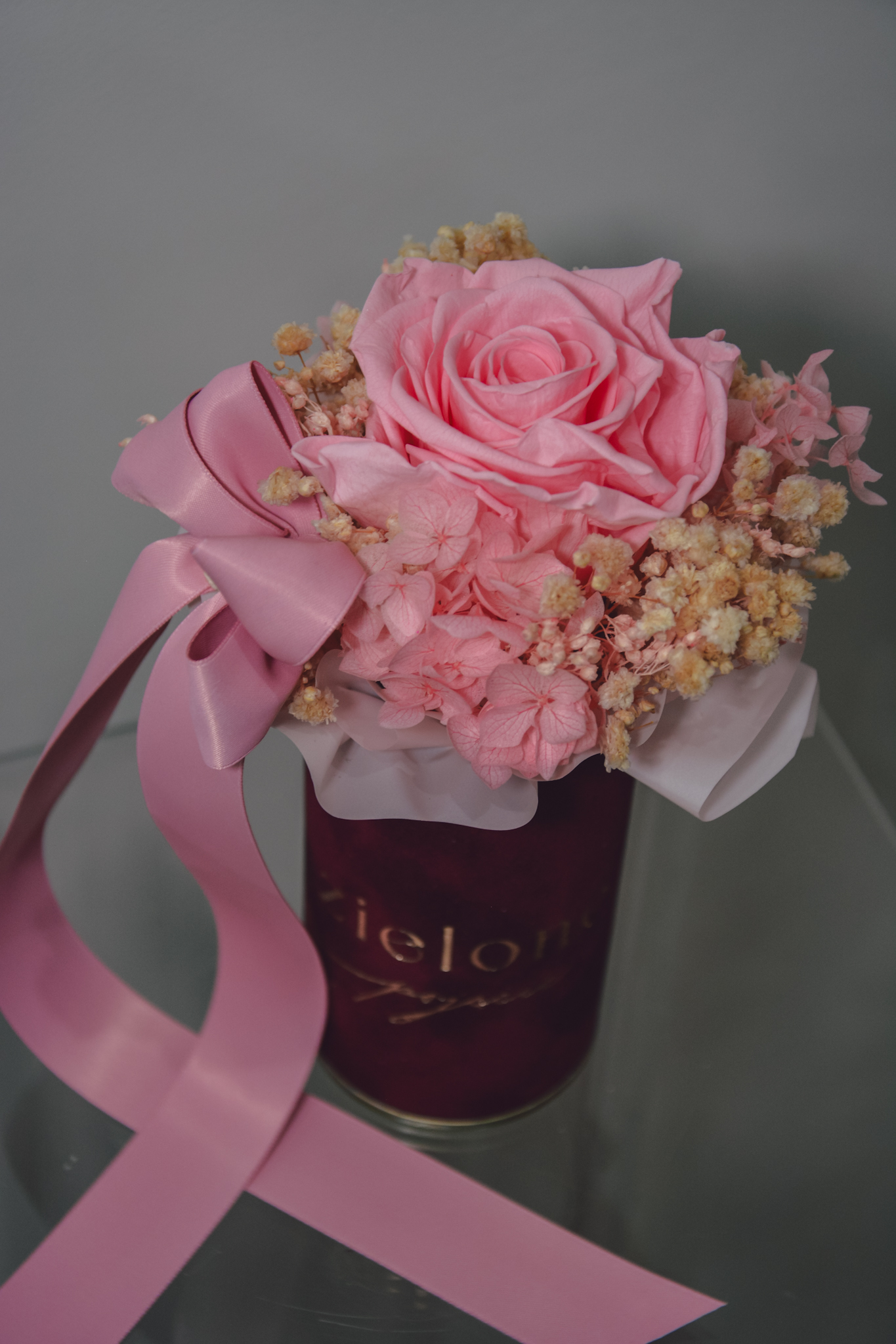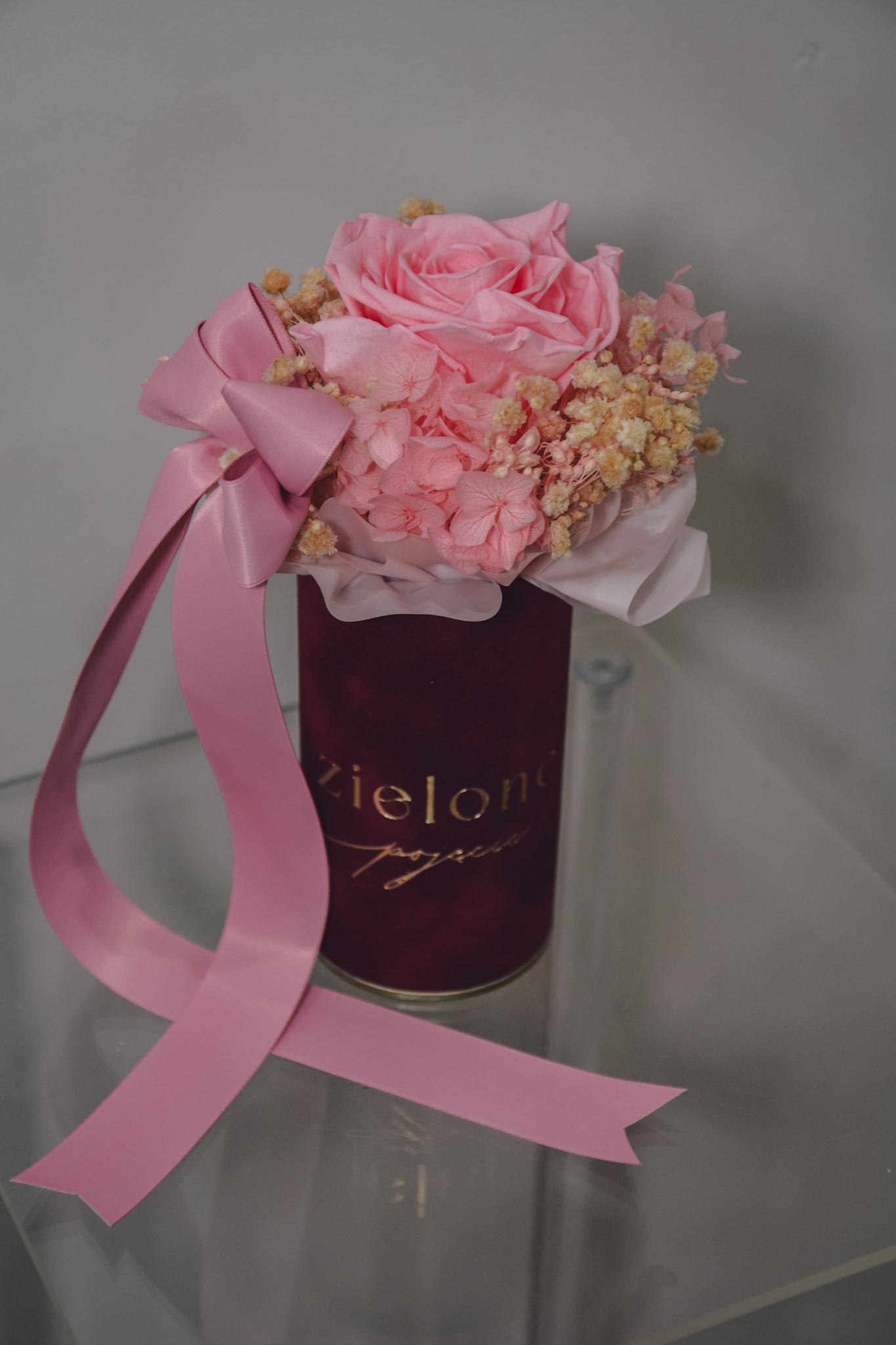 Flowerbox z róży i gipsówki stabilizowanej, całość w kolorach różowych.
