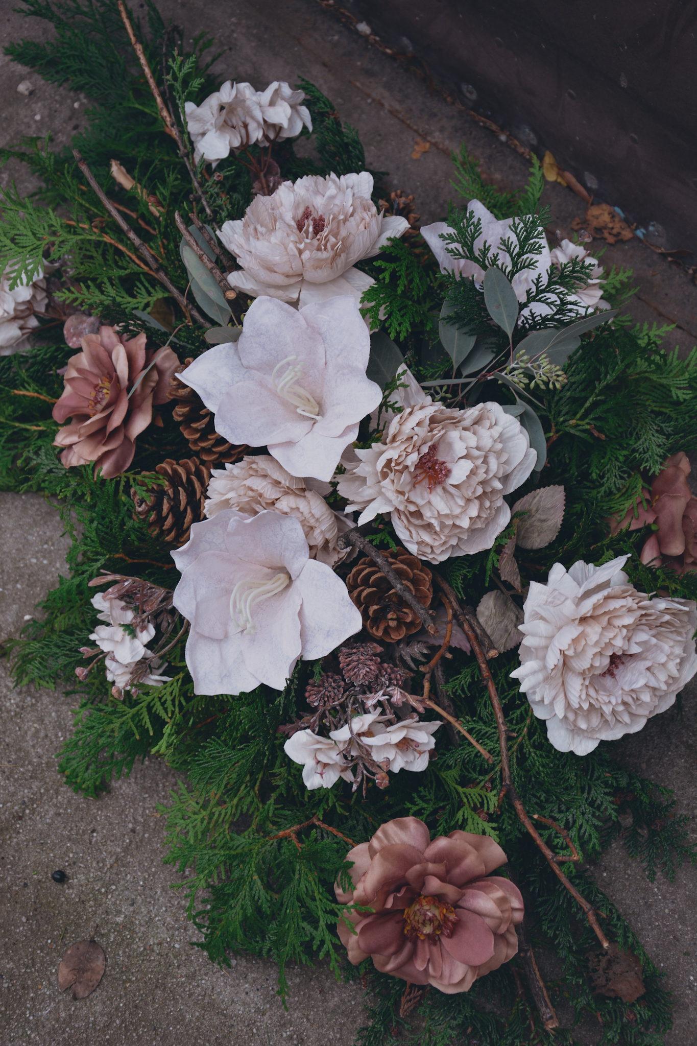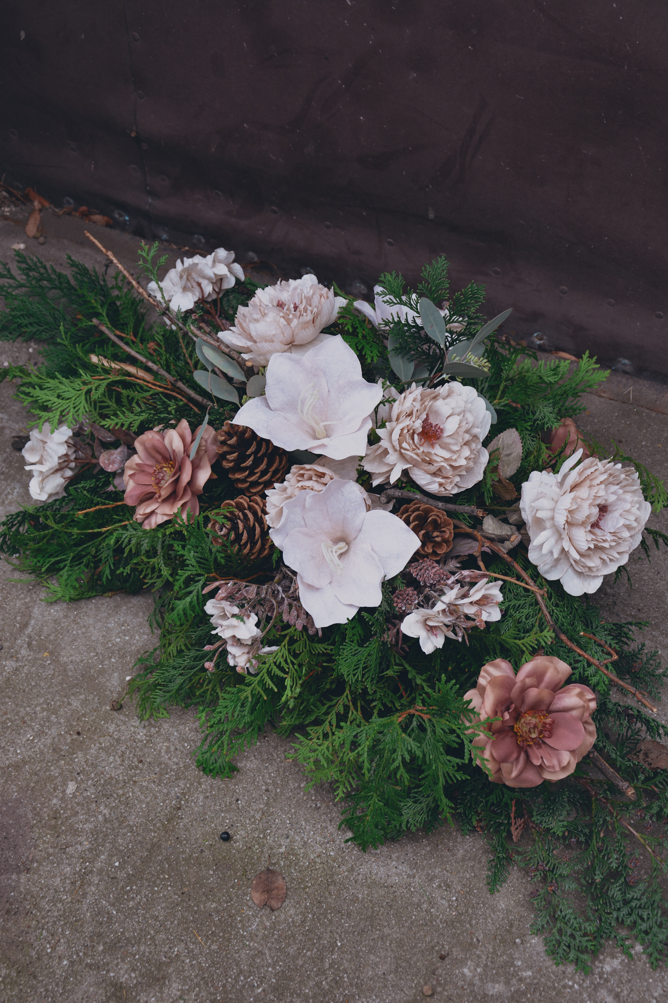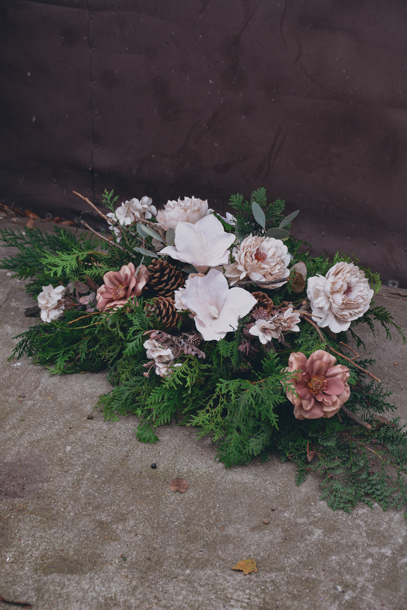 Kompozycja nagrobna w odcieniach beżu. Wykonana z kwiatów sztucznych i żywej zieleni.