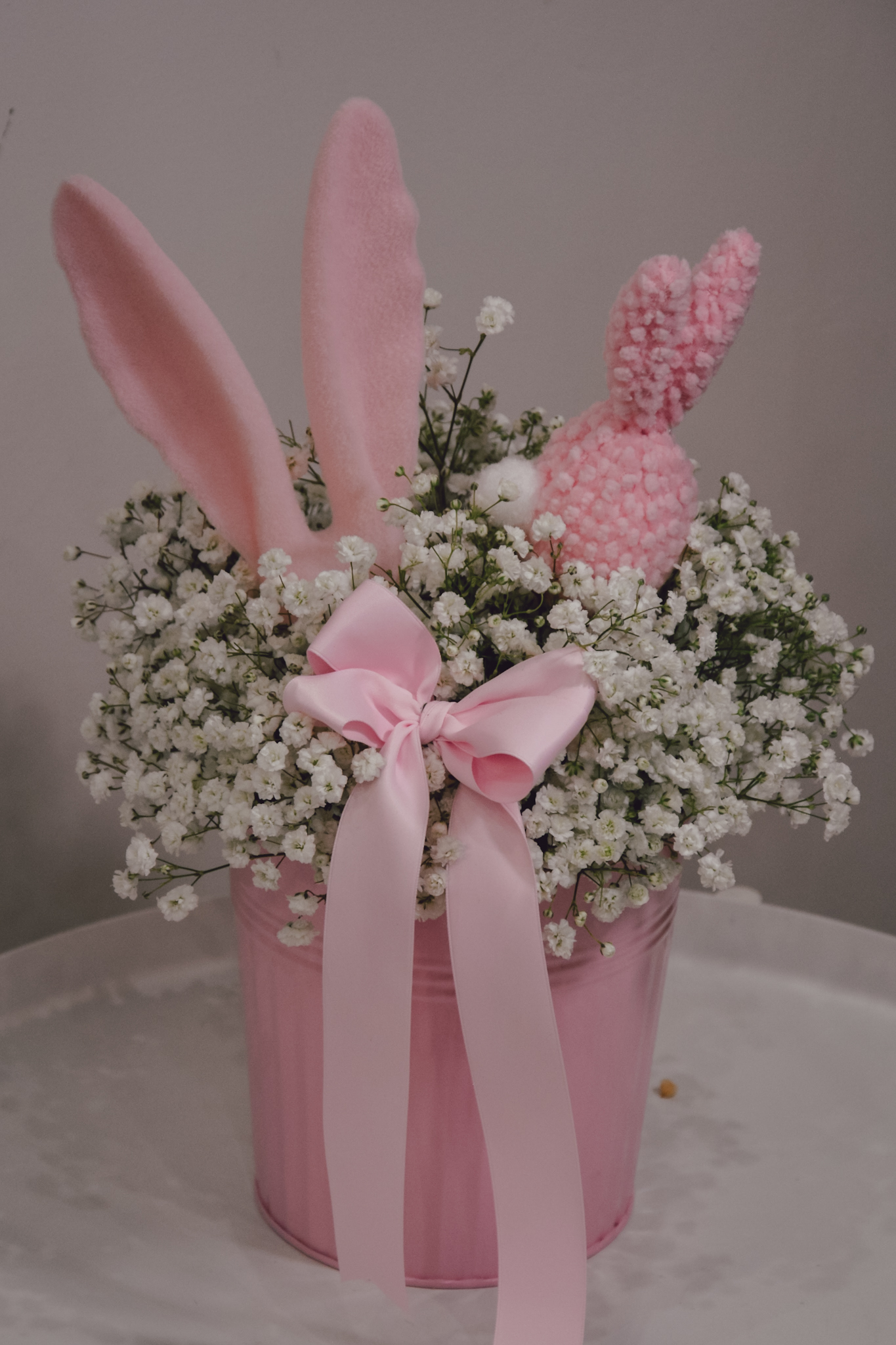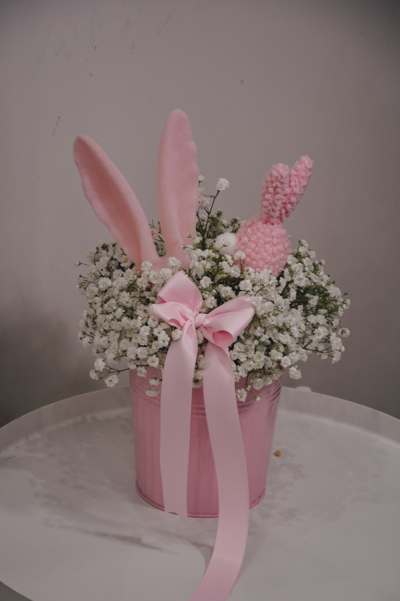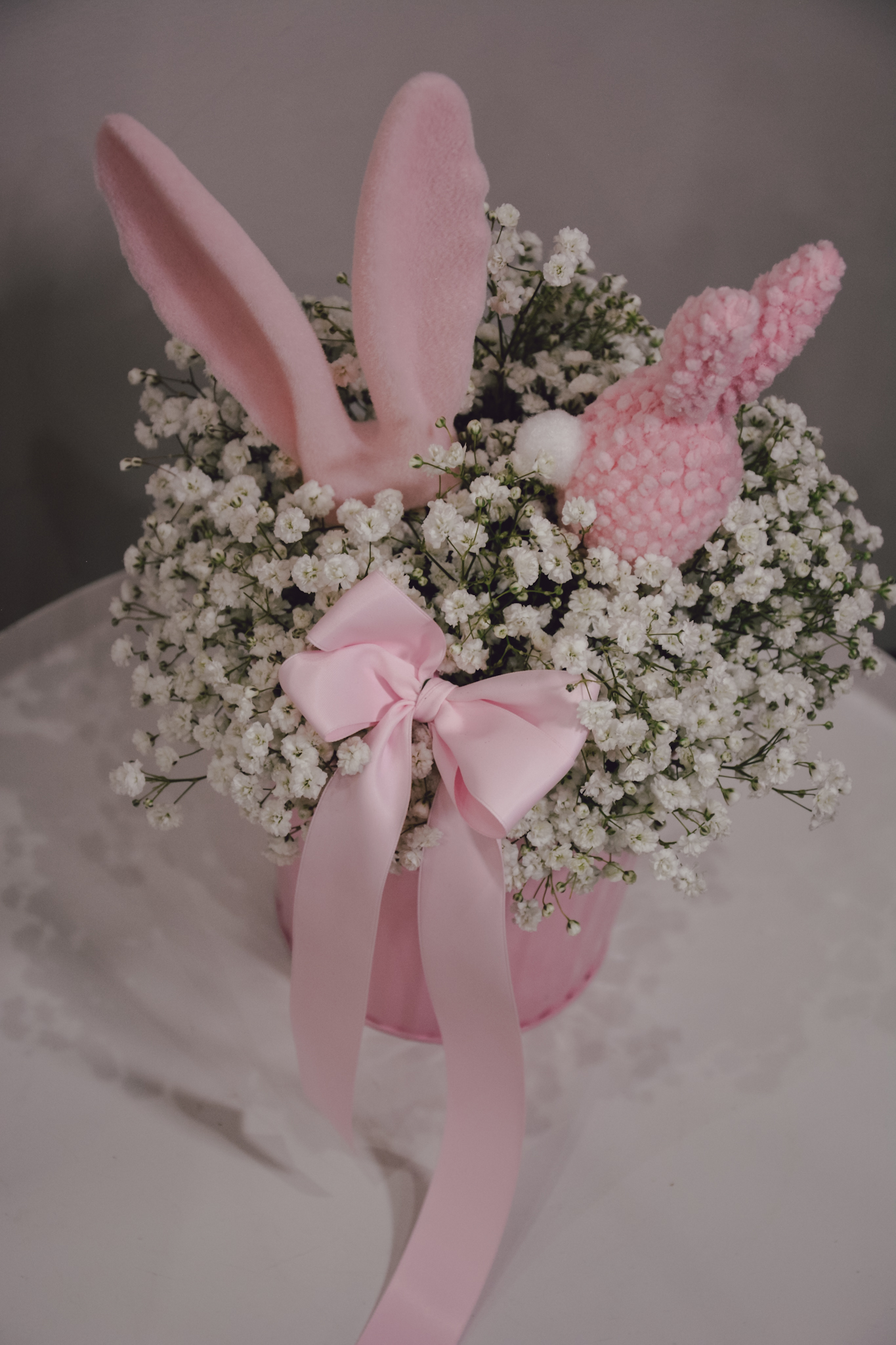 Kompozycja wielkanocna wykonana z białej gipsówki i różowych dodatków. Niektóre elementy dekoracyjne mogą delikatnie się różnić od tych ze zdjęcia, nie wpłynie to jednak znacząco na wygląd kompozycji.