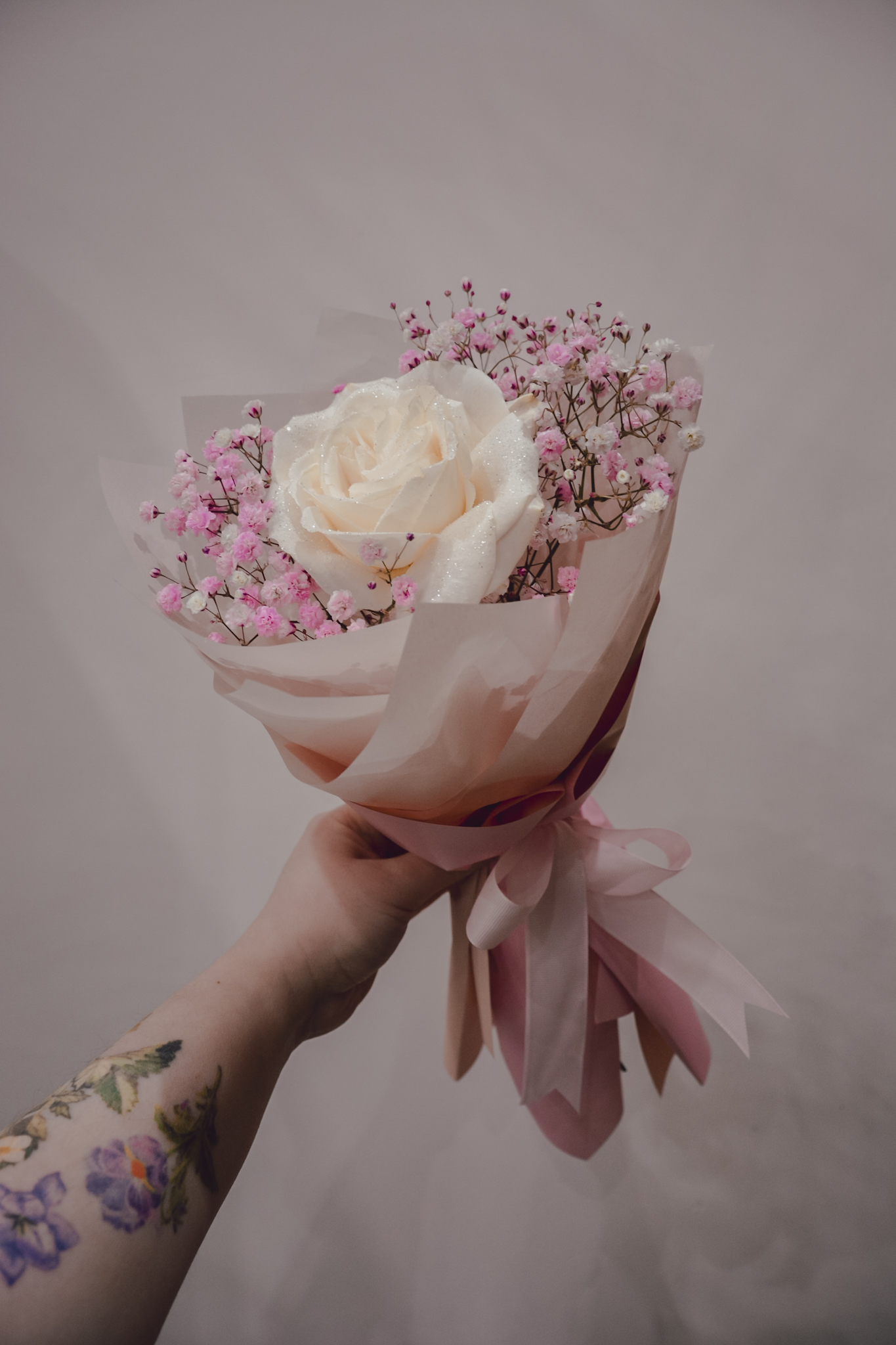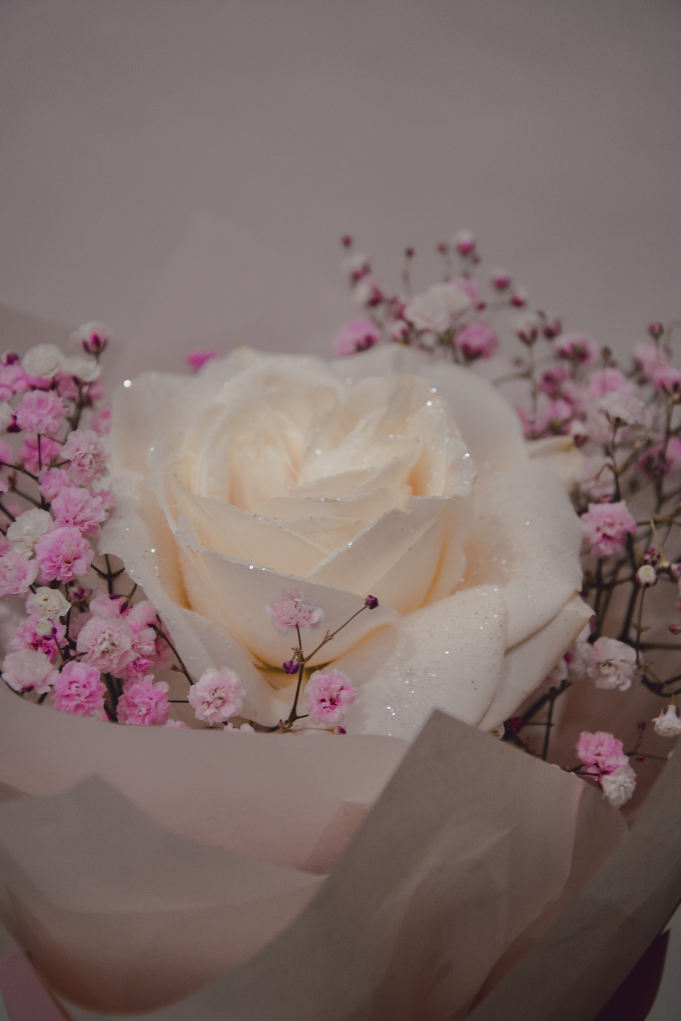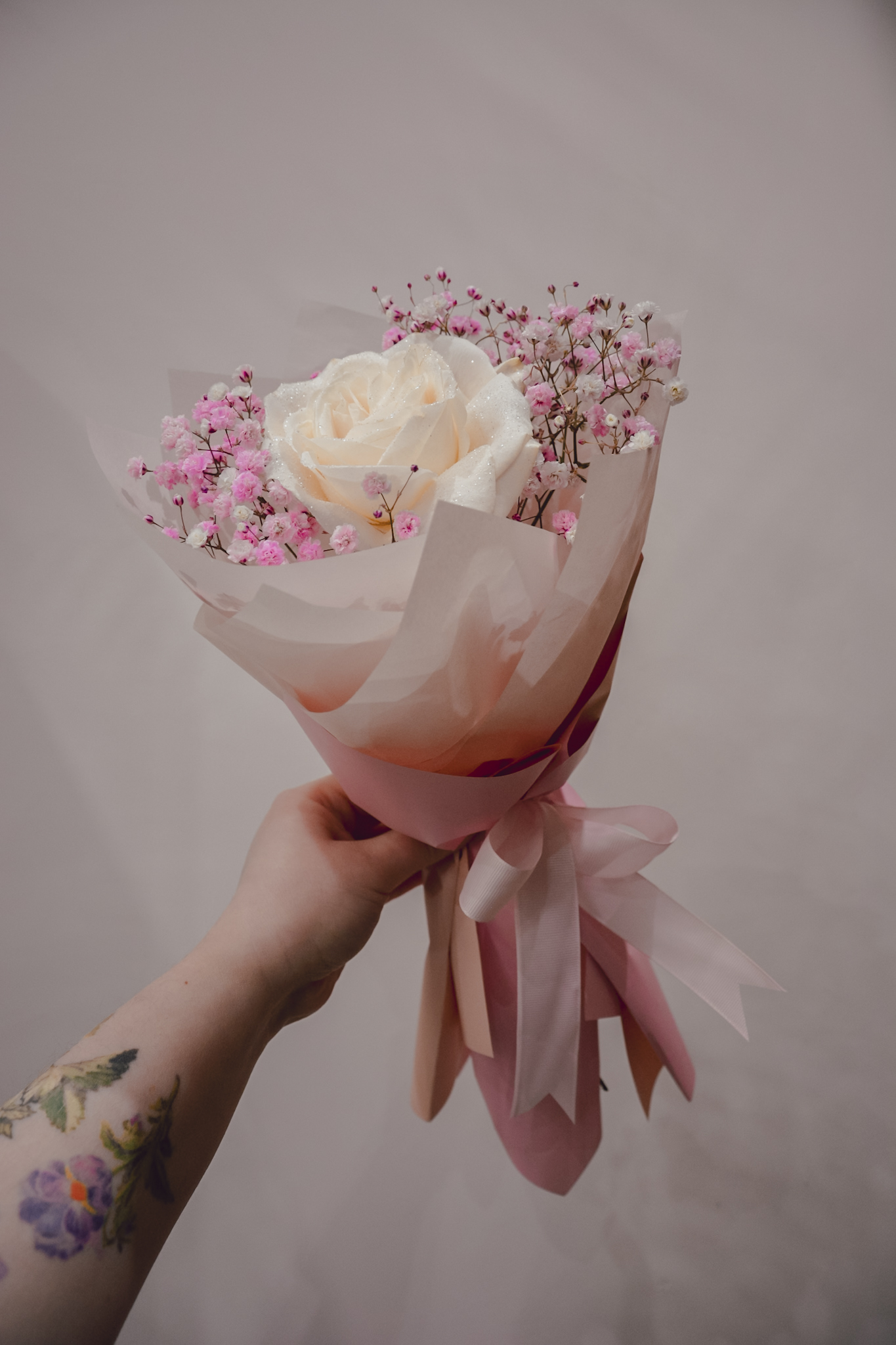 Bukiet z gipsówki i śmietankowej róży, otulony ozdobnym papierem.