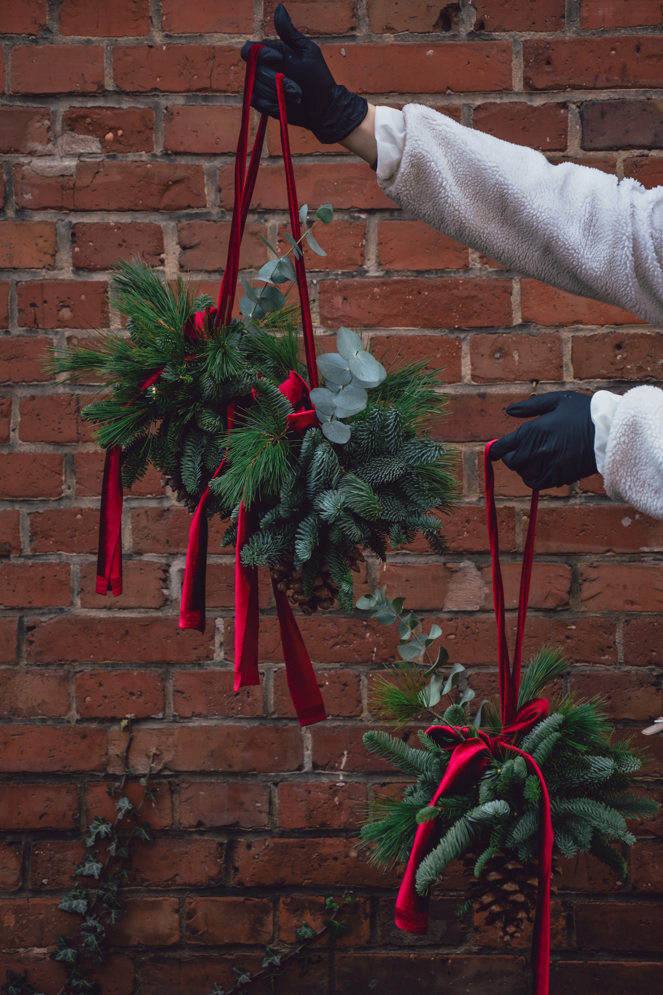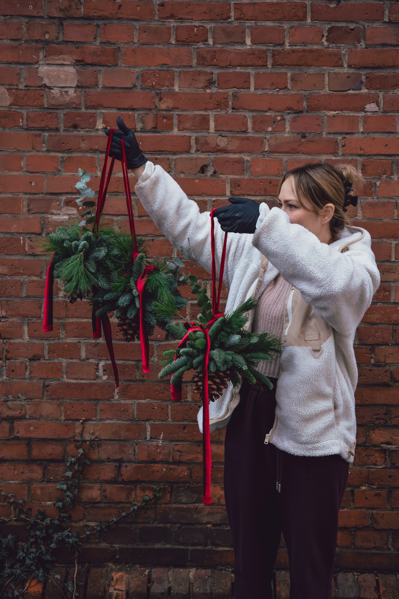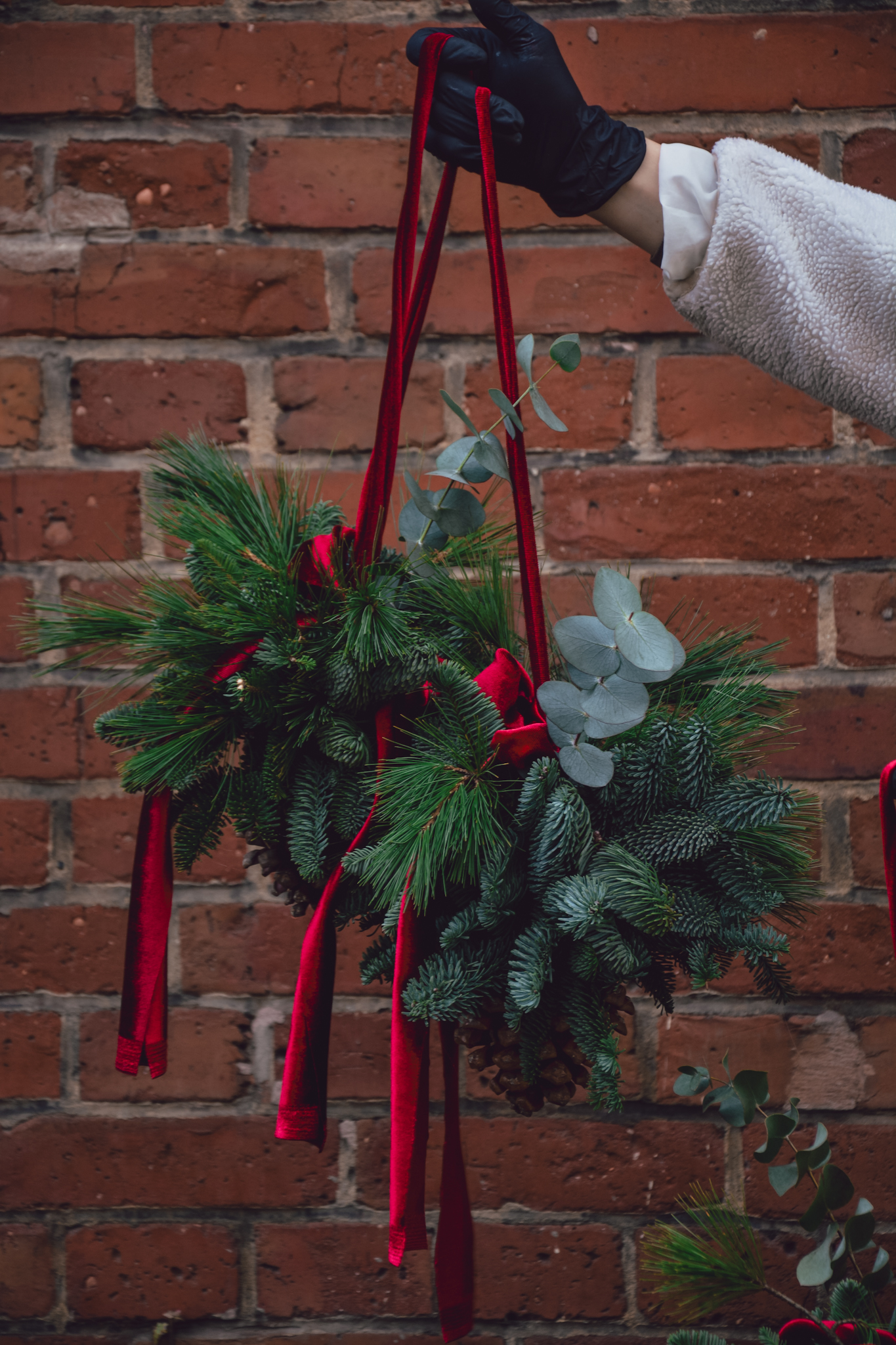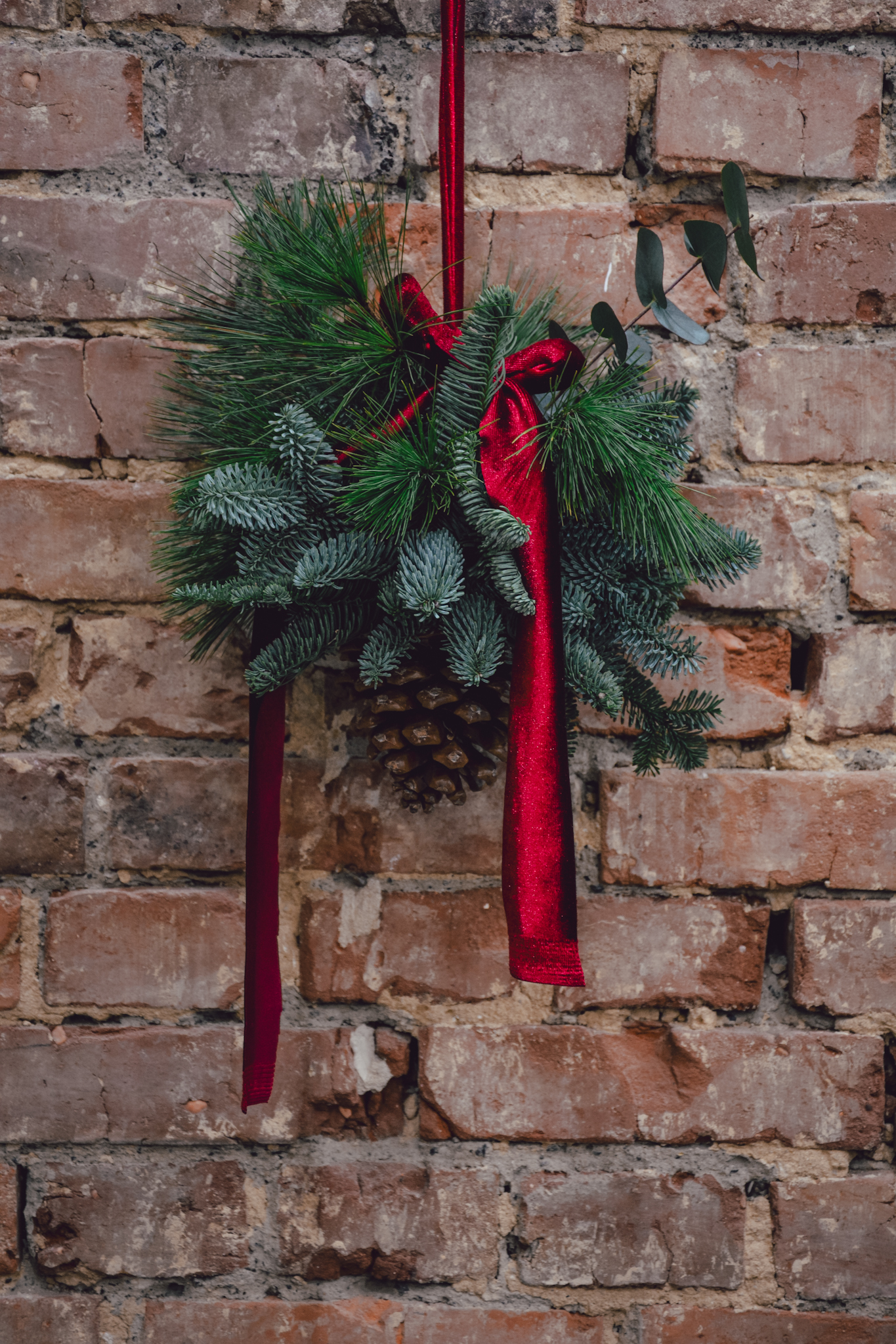 Szyszki udekorowane sosną, eukaliptusem i jodłą nobilis, w towarzystwie czerwonej wstążki.
