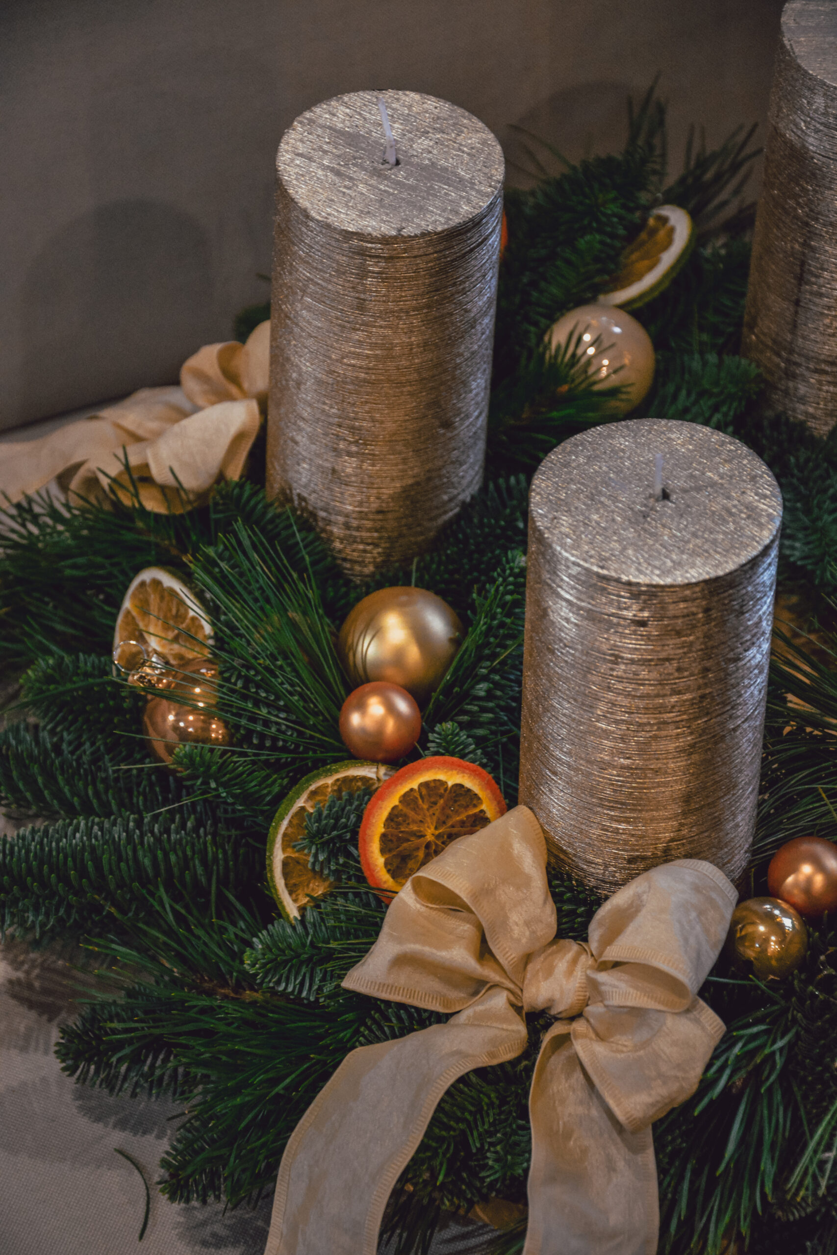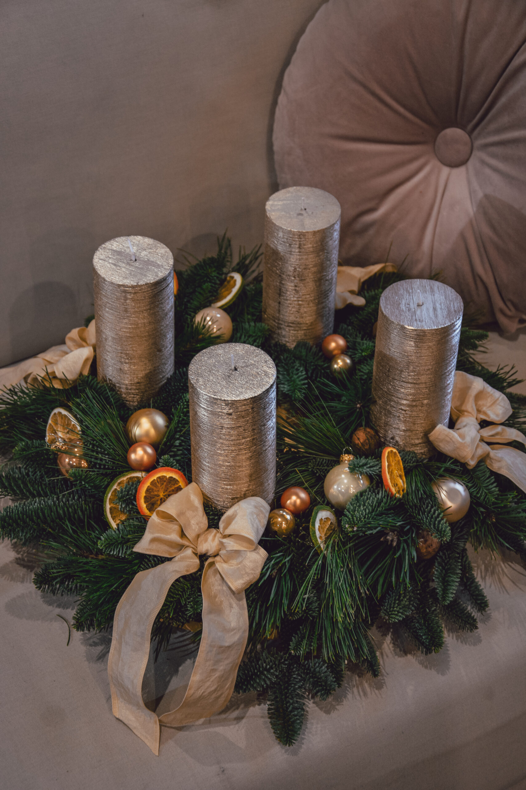 Wianek adwentowy w złocie Kompozycja wykonana z żywej zieleni, jodły nobilis.