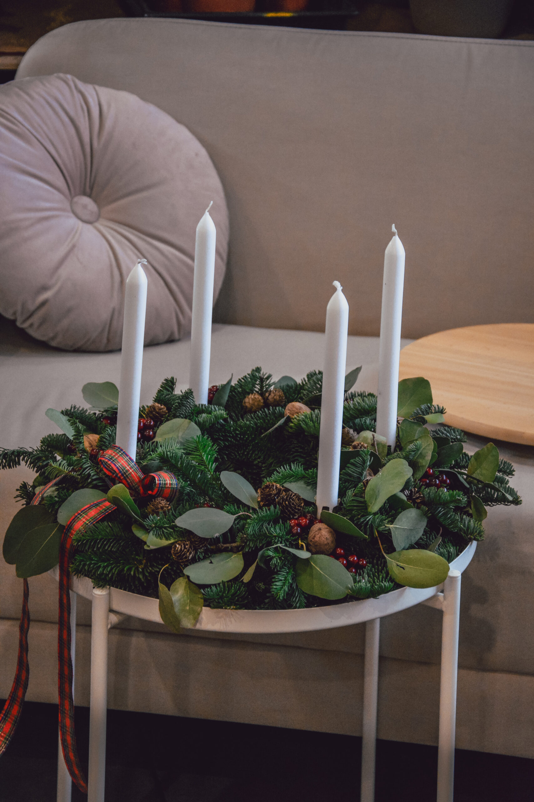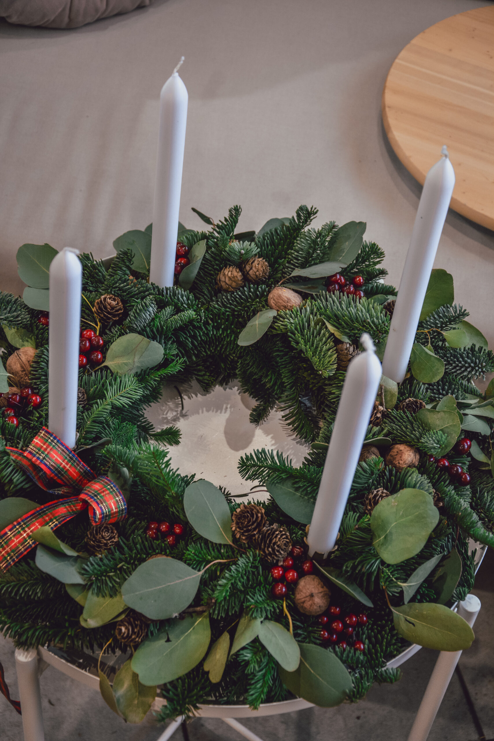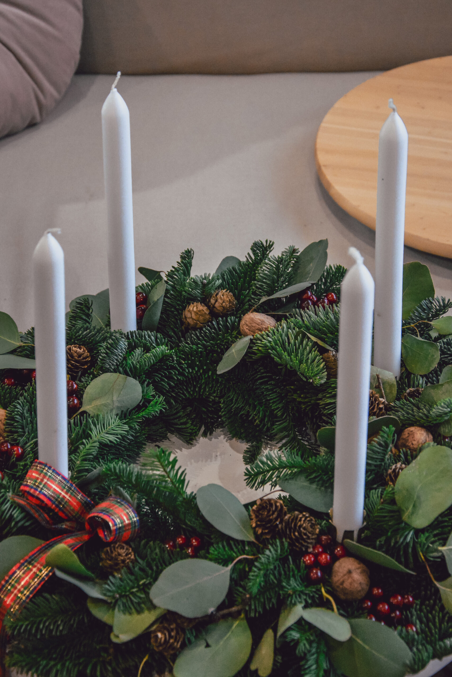 Wianek adwentowy z kokardą w kratę Kompozycja wykonana z żywej zieleni, jodły nobilis.