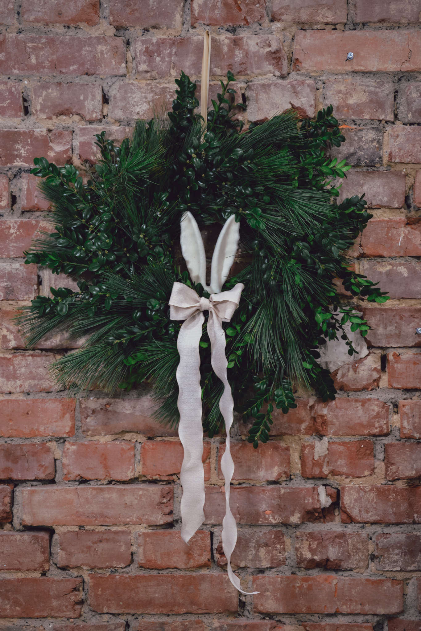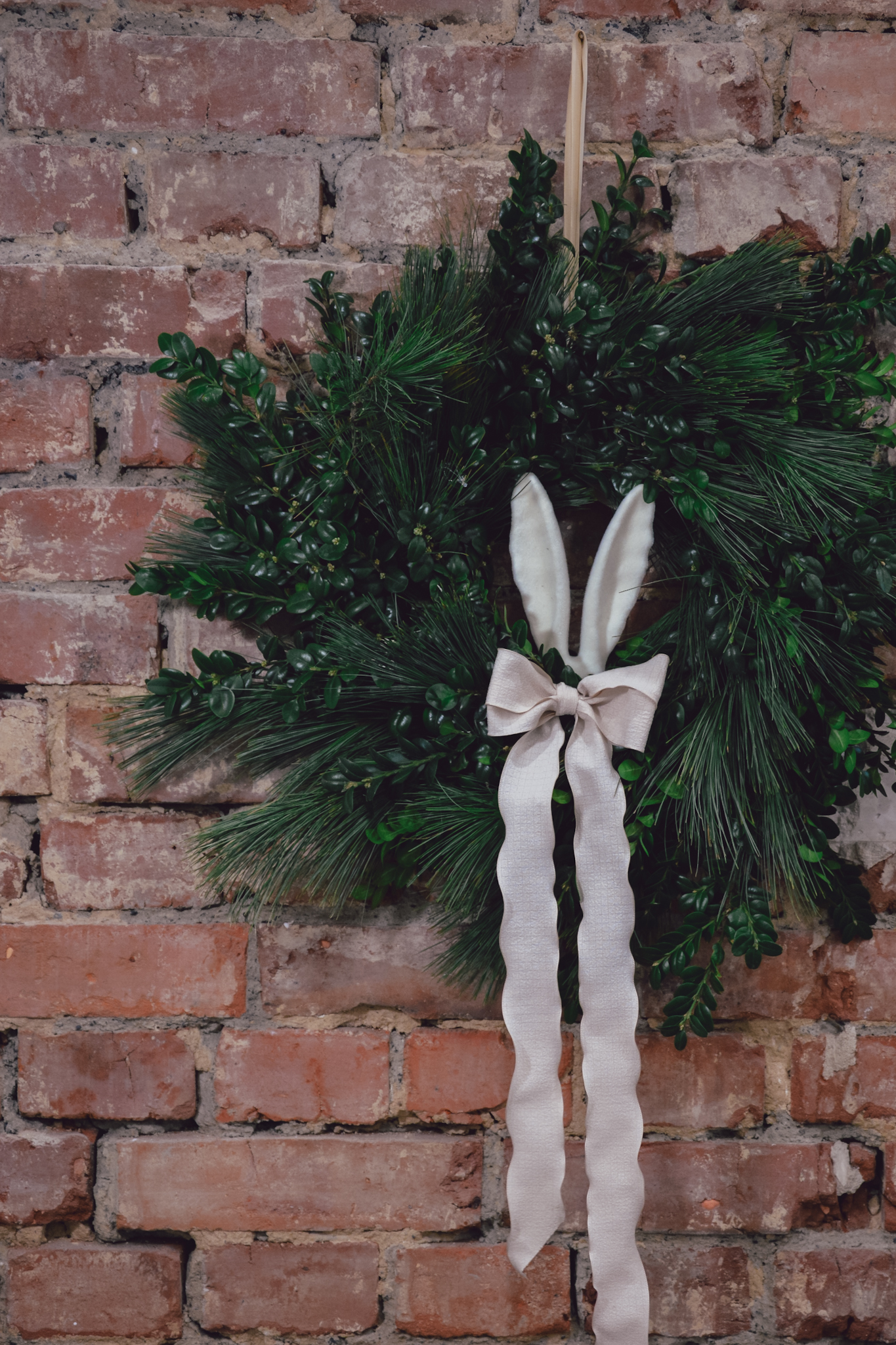 Wianek z bukszpanu, tui i sosny o średnicy około 50 cm. Niektóre elementy dekoracyjne mogą delikatnie się różnić od tych ze zdjęcia, nie wpłynie to jednak znacząco na wygląd kompozycji.